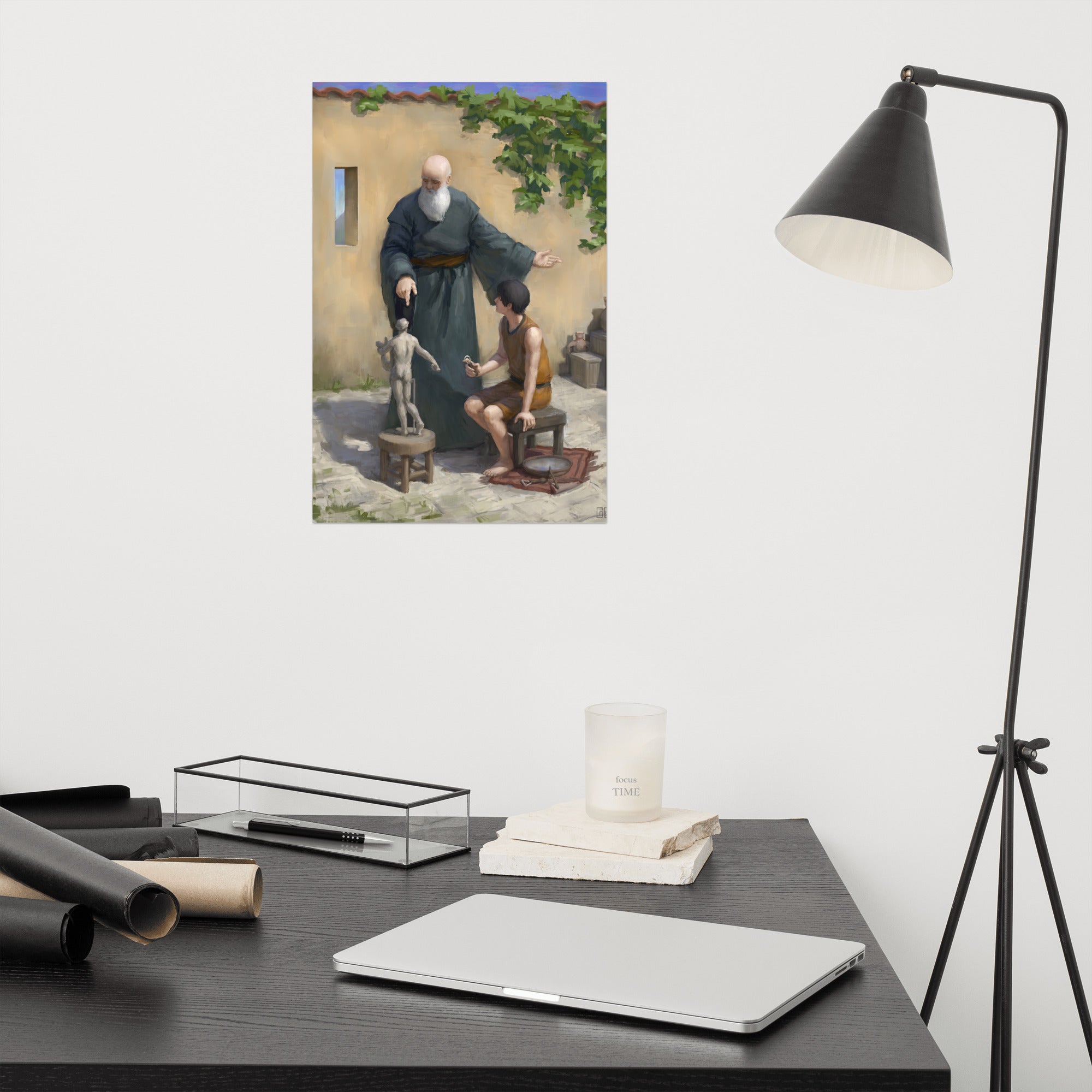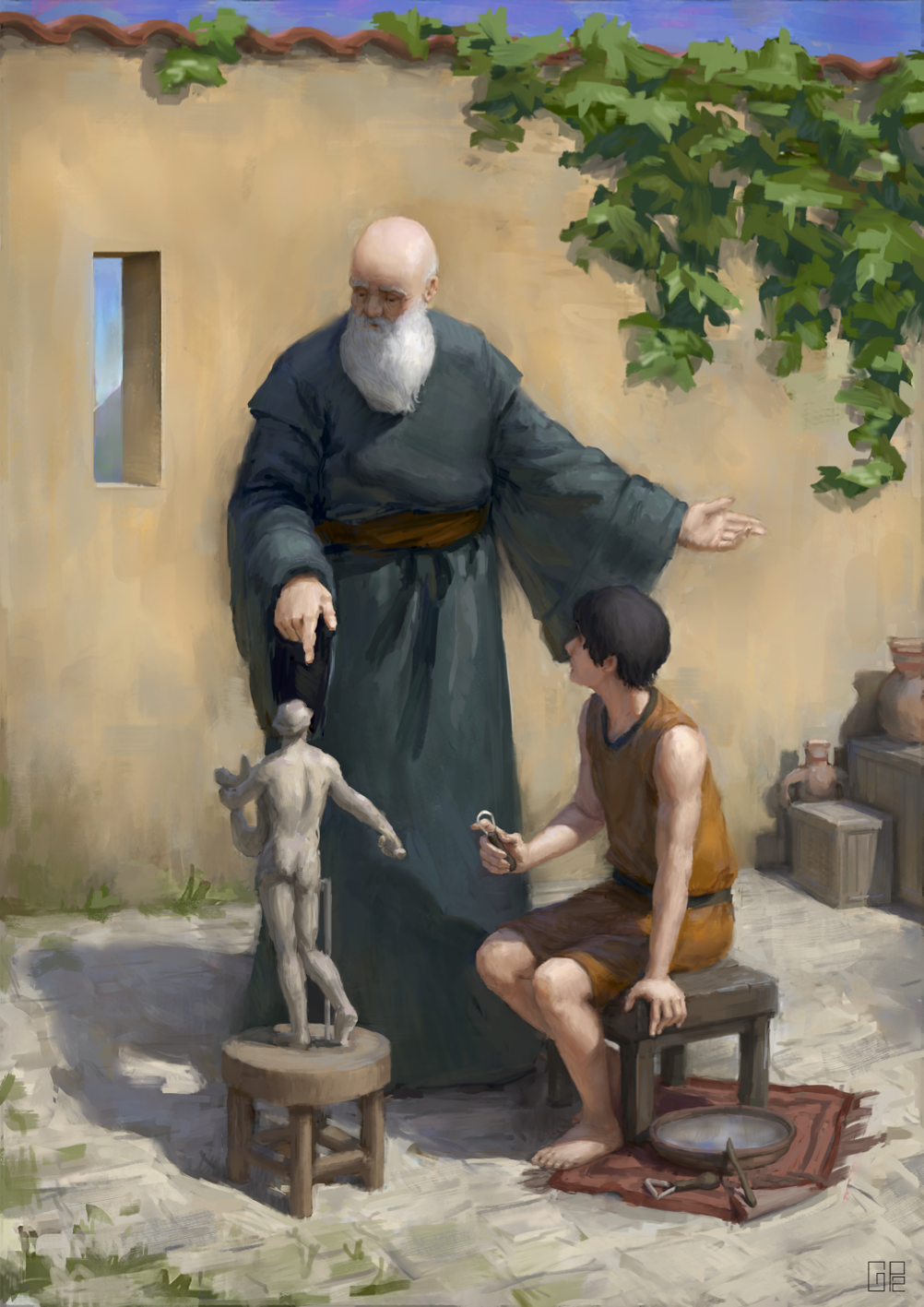 The piece focuses on a fundamental aspect of humanity: learning and the passing down of knowledge. It depicts a young boy learning to sculpt under the guidance of an older mentor. Beyond the act of teaching a craft, the mentor also represents the role guidance plays in shaping who we become.