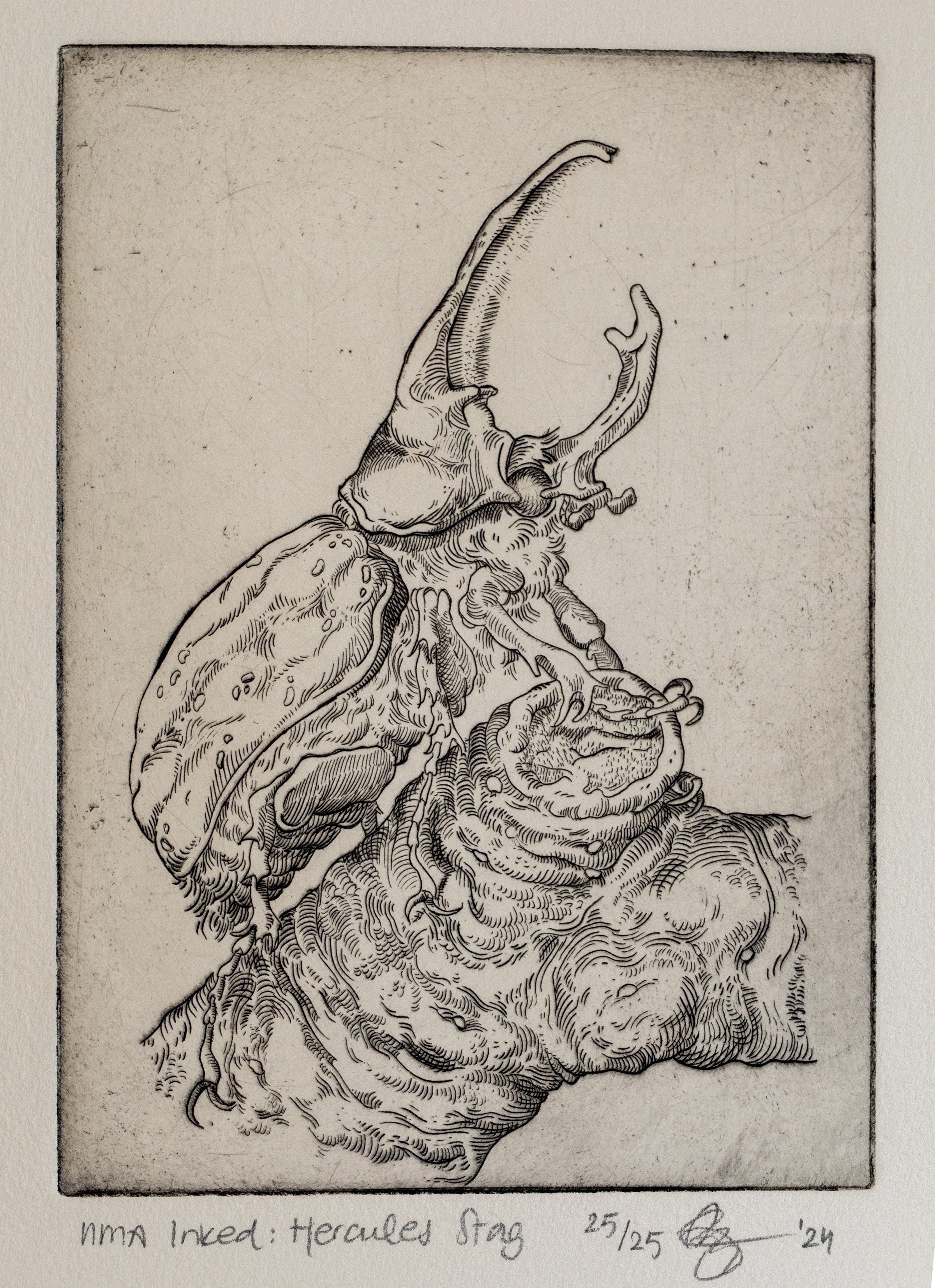 This beautifully designed copperplate etching of a rhinoceros beetle is a rare original take on a historical subject favored by Dutch printmakers and naturalists by artist Maartje Fleetwood and master printmaker Alex Jackson.